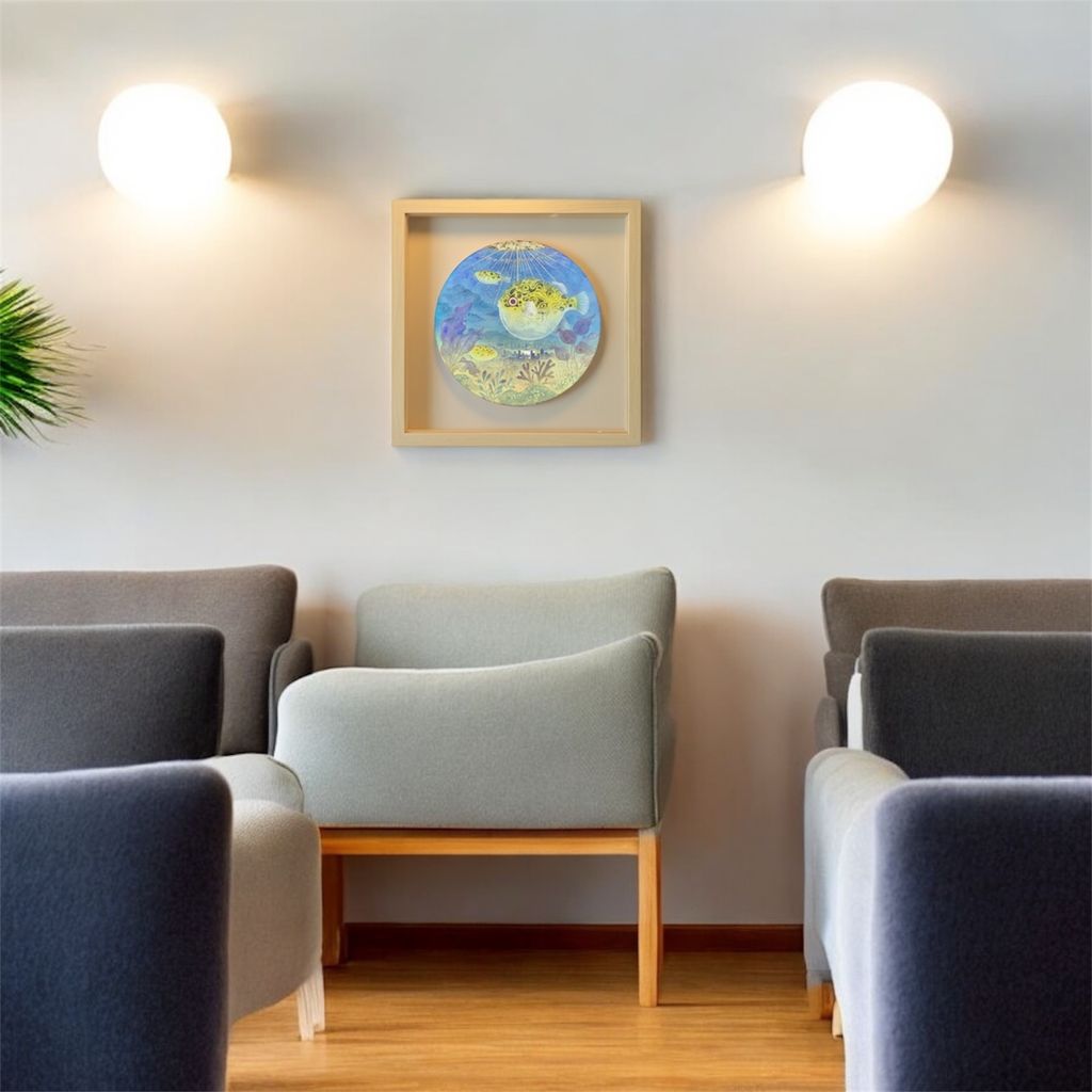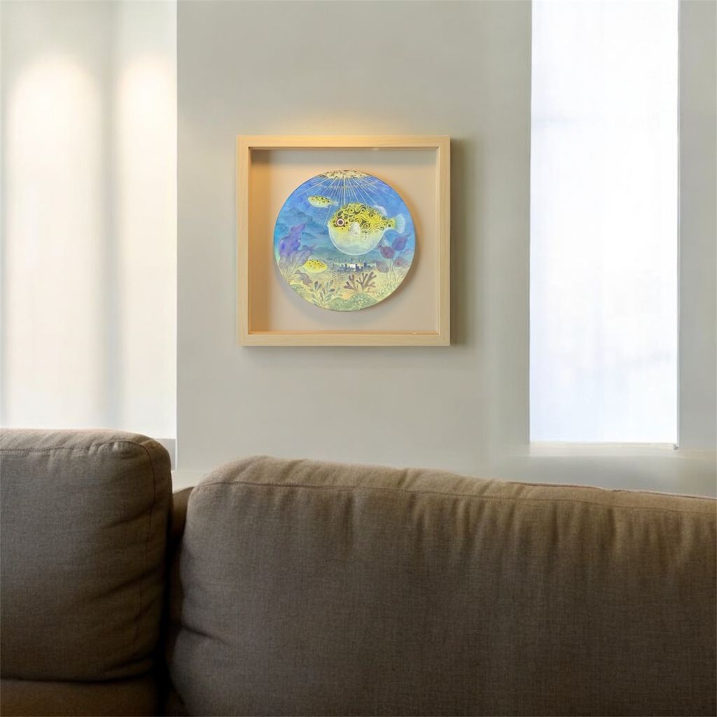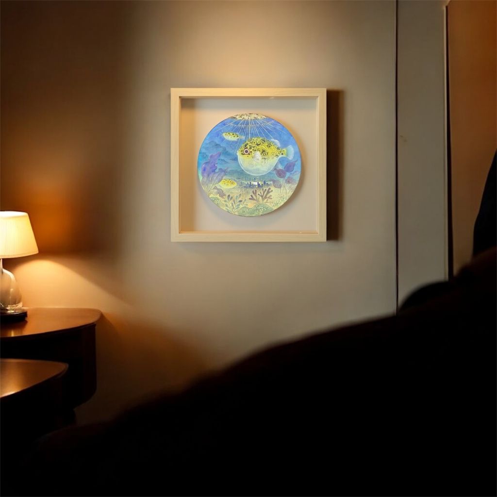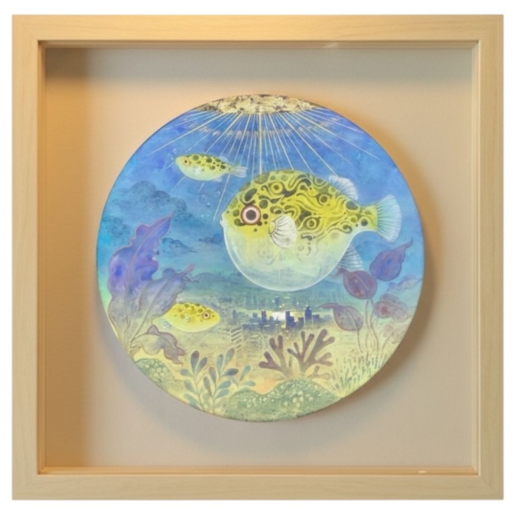 懸浮的夢境魚缸,承載著記憶與想像的交融。畫面中膨脹的河豚悠遊於城市天際線之間,現實與幻想在此交織。