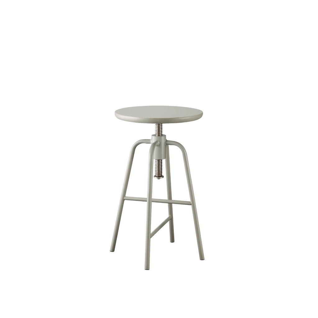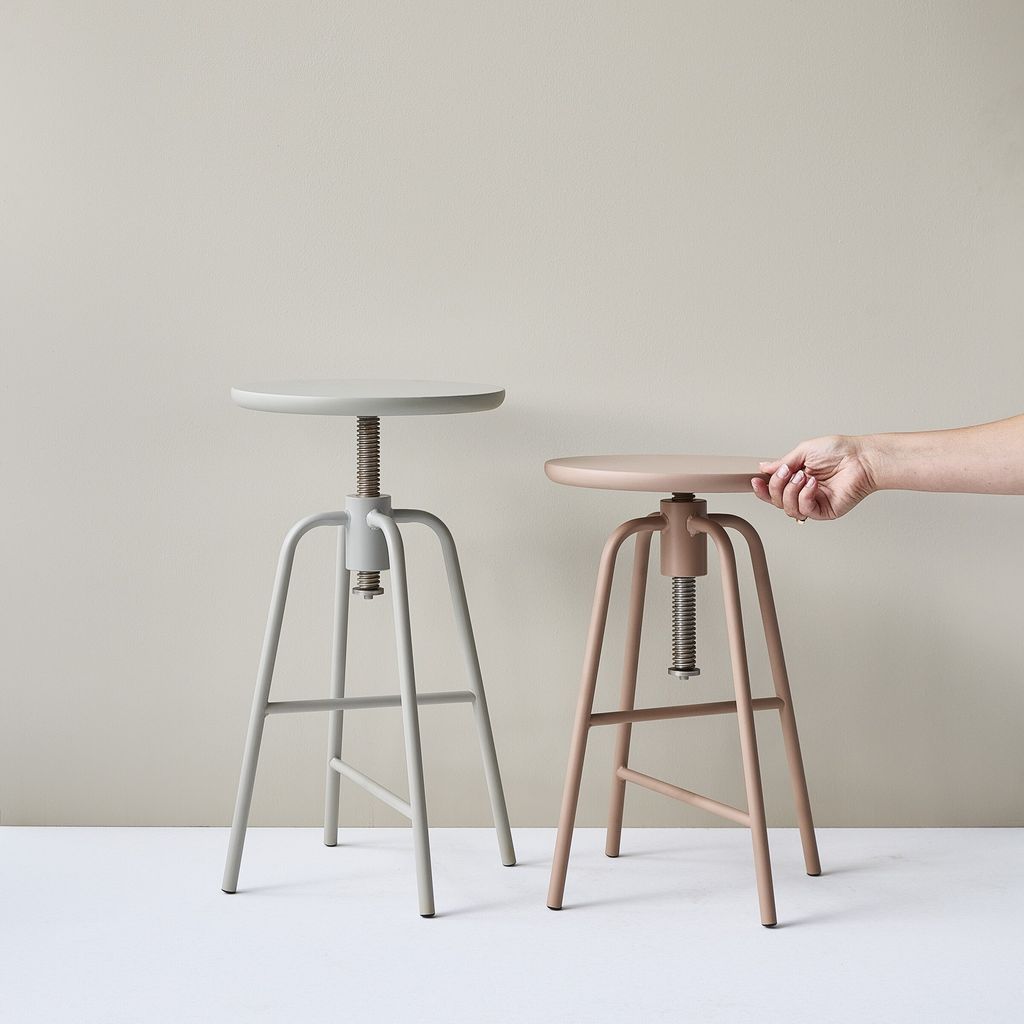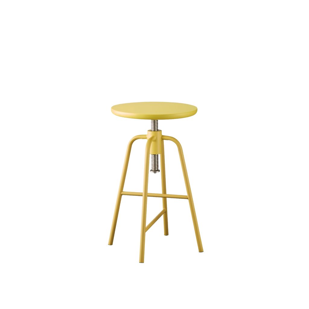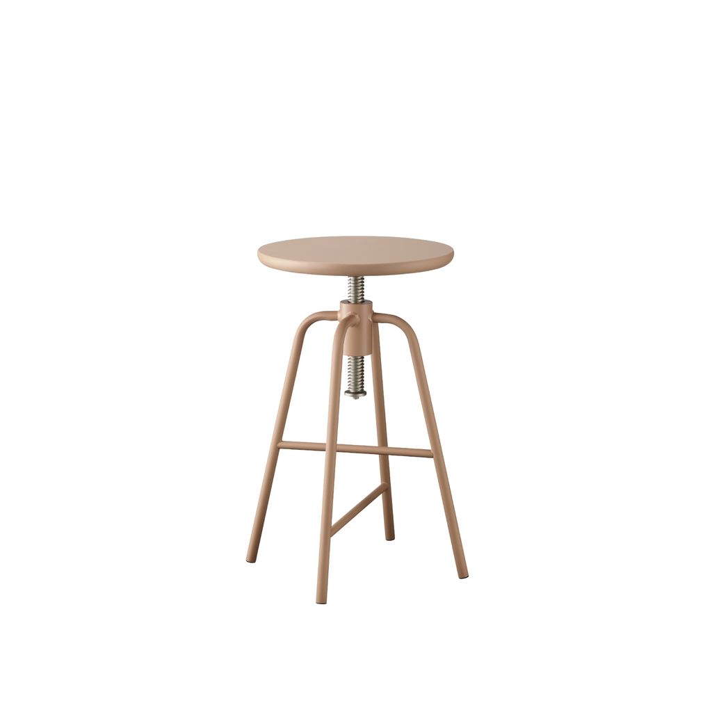 延伸咖啡桌的設計概念,旋轉椅凳的高度可以升降調節,找到最適合自己的座椅高度,鐵質的椅腳耐重且有設計感,搭配木頭椅面讓產品顯得柔和親近。