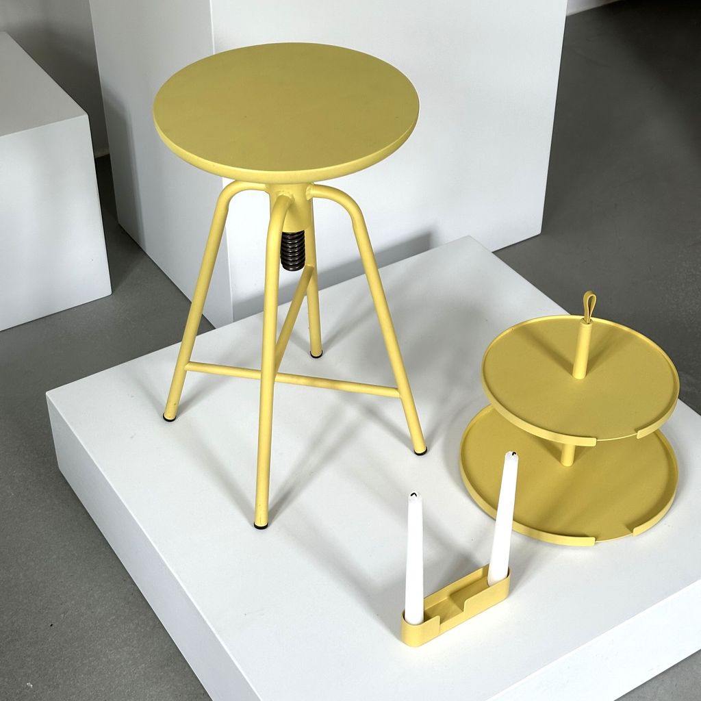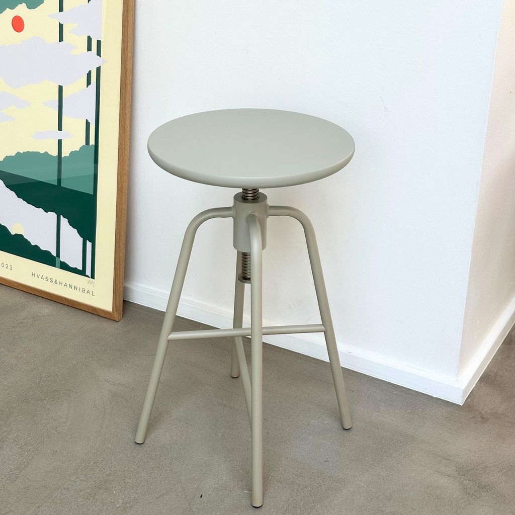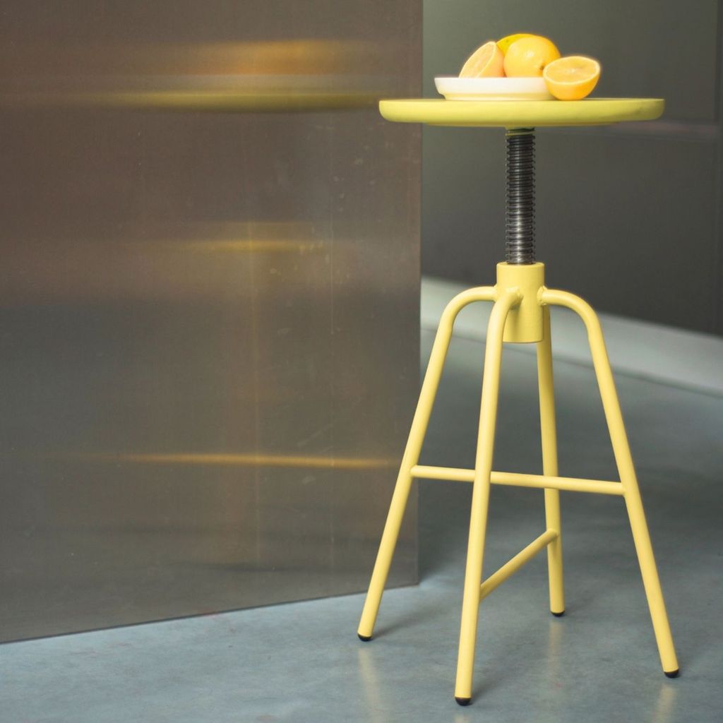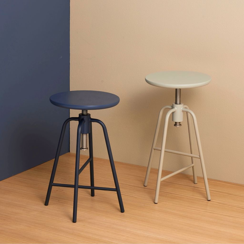 延伸咖啡桌的設計概念,旋轉椅凳的高度可以升降調節,找到最適合自己的座椅高度,鐵質的椅腳耐重且有設計感,搭配木頭椅面讓產品顯得柔和親近。