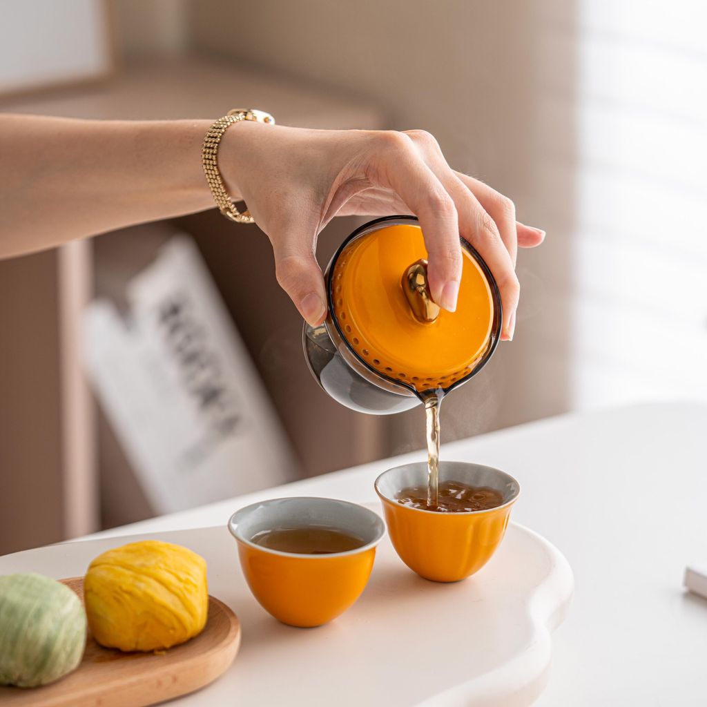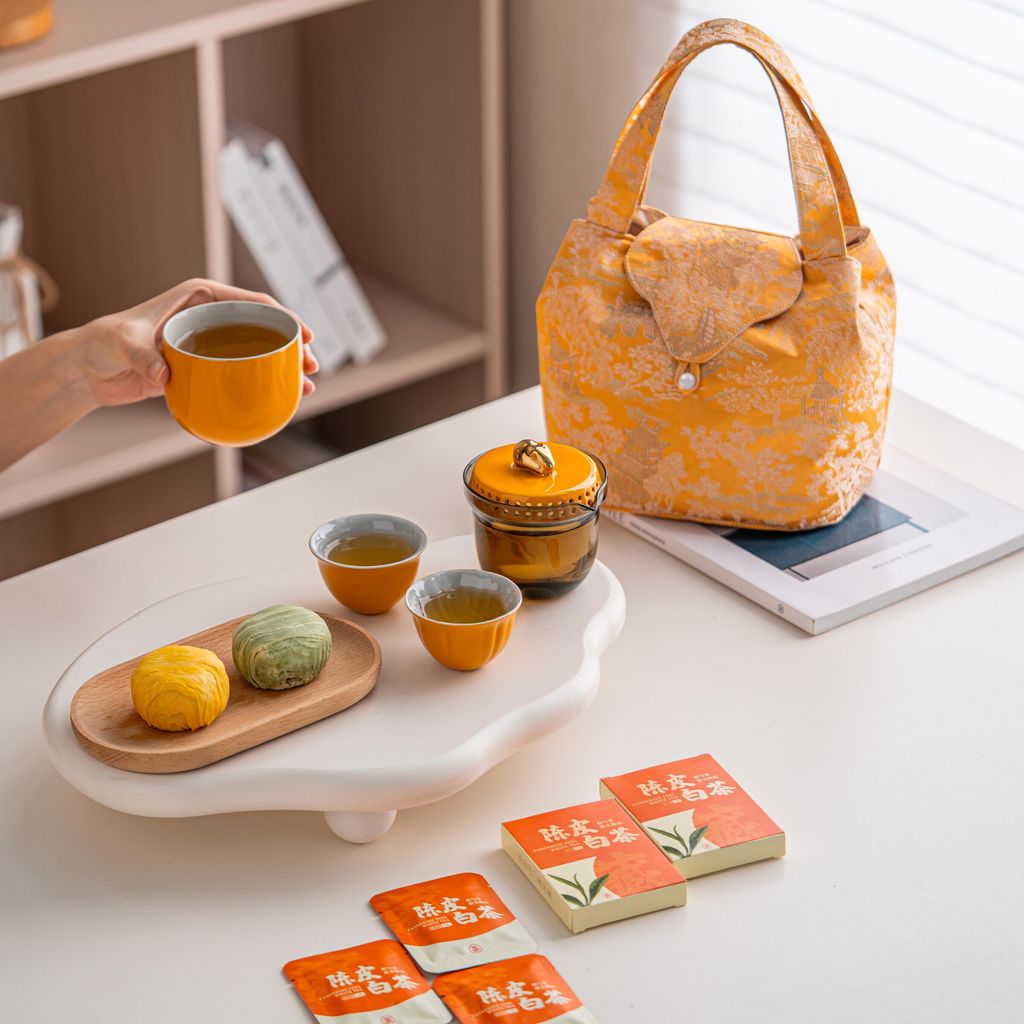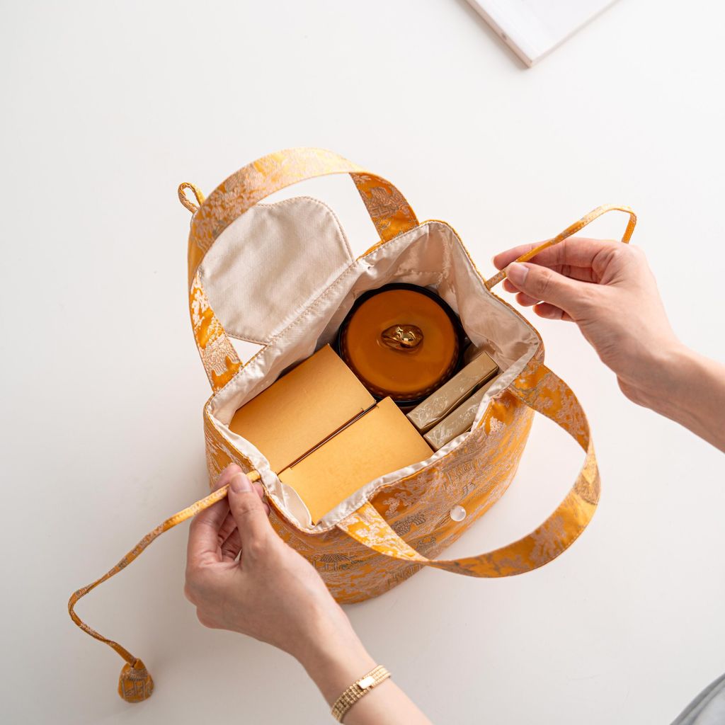 以中秋月團圓意象為設計,提袋採用了金黃色系如同月亮光輝般奪目,裡頭的杯身同樣也與其呼應用上了暖色系,一起在月下談天配上一口酥餅與茶包,何樂而無不為?