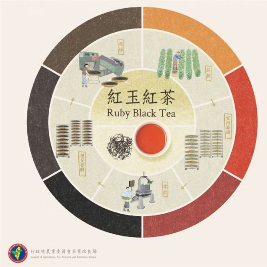 紅茶製程以重度萎凋與發酵為核心,紅玉則更仰賴茶師的火候掌控與直覺精準。由熟葉嫩芽製成的茶菁,在經過熱風萎凋後進行強度揉捻,使茶葉表面細胞壁充分破裂,促成香氣與茶紅素的高度釋放;不經殺菁,紅玉透過高溫乾燥定型,最終呈現出色澤艷紅、香氣奔放、口感厚實且回甘鮮明的獨特表現。因其特殊且具有高度辨識性的香氣,被譽為「台灣香」。