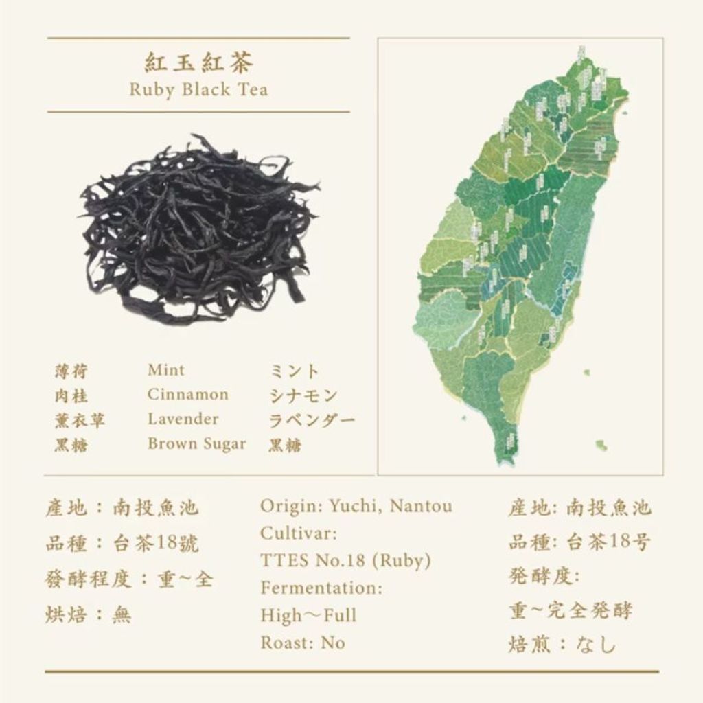 紅玉紅茶,被譽為「台灣紅茶的代名詞」,其名源自茶改場育種第十八號(台茶18號),常見於魚池、日月潭一帶的茶園。這款大葉種紅茶,有著天然、強烈的肉桂與薄荷氣息,香氣奔放而高度辨識,是全球茶愛好者心中的「Ruby Black Tea」——紅寶石般瑰麗而不容忽視。
