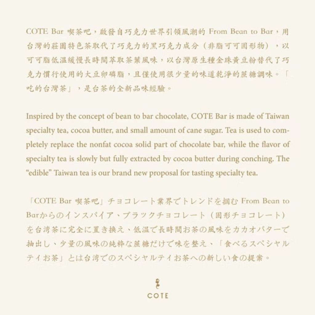 本款聯名 COTE「茶巧克」ChaChoco Bar,嚴選來自南投魚池、由特等獎茶師莊鎔璞親製的紅玉紅茶(台茶18號)。茶菁選用熟葉嫩芽,歷經精準萎凋、完整揉捻與細緻焙火,將紅玉獨有的薄荷與肉桂香氣保留至極致,並轉化為喫風味吧中的層層風味——入口涼感舒展,隨之而來的是絲絨般柔滑的澀感,餘韻悠長、帶有紅茶特有的蜜韻與香料氣息,為整體體驗增添溫潤又不失個性的茶韻深度。